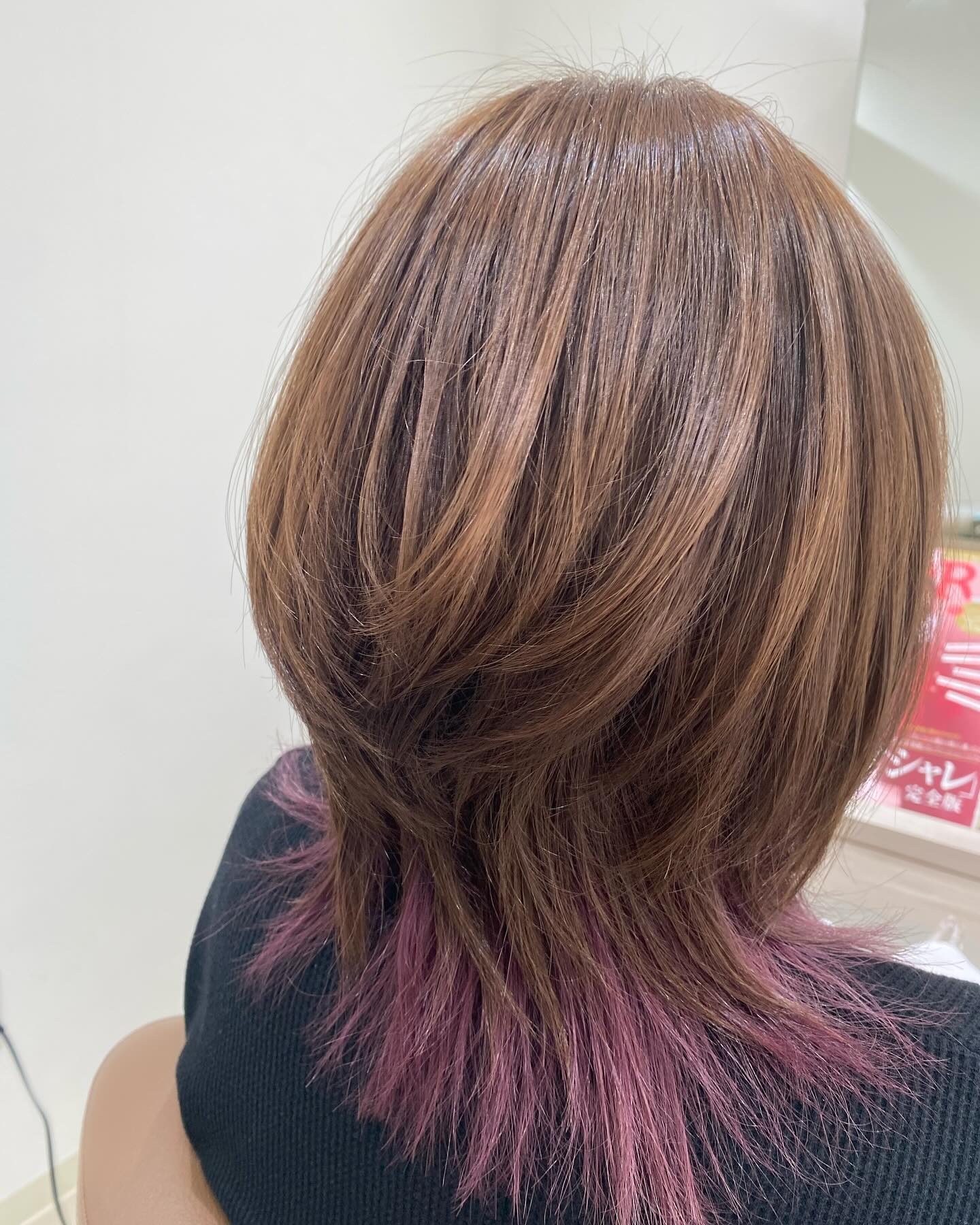 トップにボリュームを出してエレガントに仕上げました。インナーカラーのブリーチをしてあるので綺麗にピンク紫になりました。